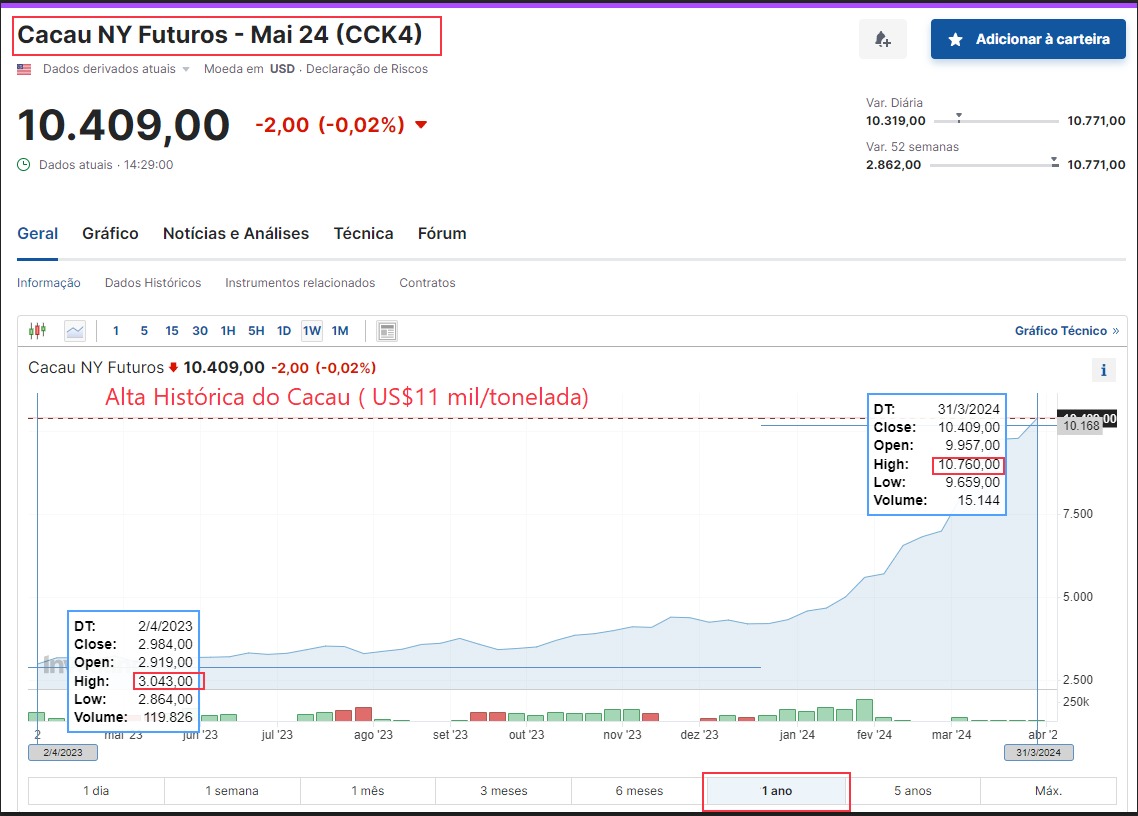 Em abril de 2024, o preço do cacau atingiu cerca de USD 11.000 por tonelada, o que representa um aumento de cerca de 200% se compararmos aos níveis vistos há um ano atrás. Inclusive, ultrapassou o recorde histórico de 1977, quando o valor do cacau atingiu o patamar de cerca de USD 5.000 por tonelada.
